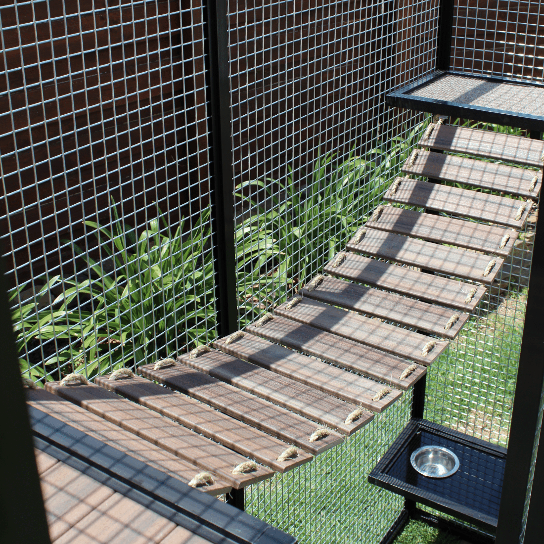 These bridges are designed to attach to 2 of Royal Roosteres shelves installed at the same height. These shelves can be fixed to your Royal Rooster cat enclosure or an indoor or outdoor wall of your home. Your bridge is then attached to these shelves with brackets provided.